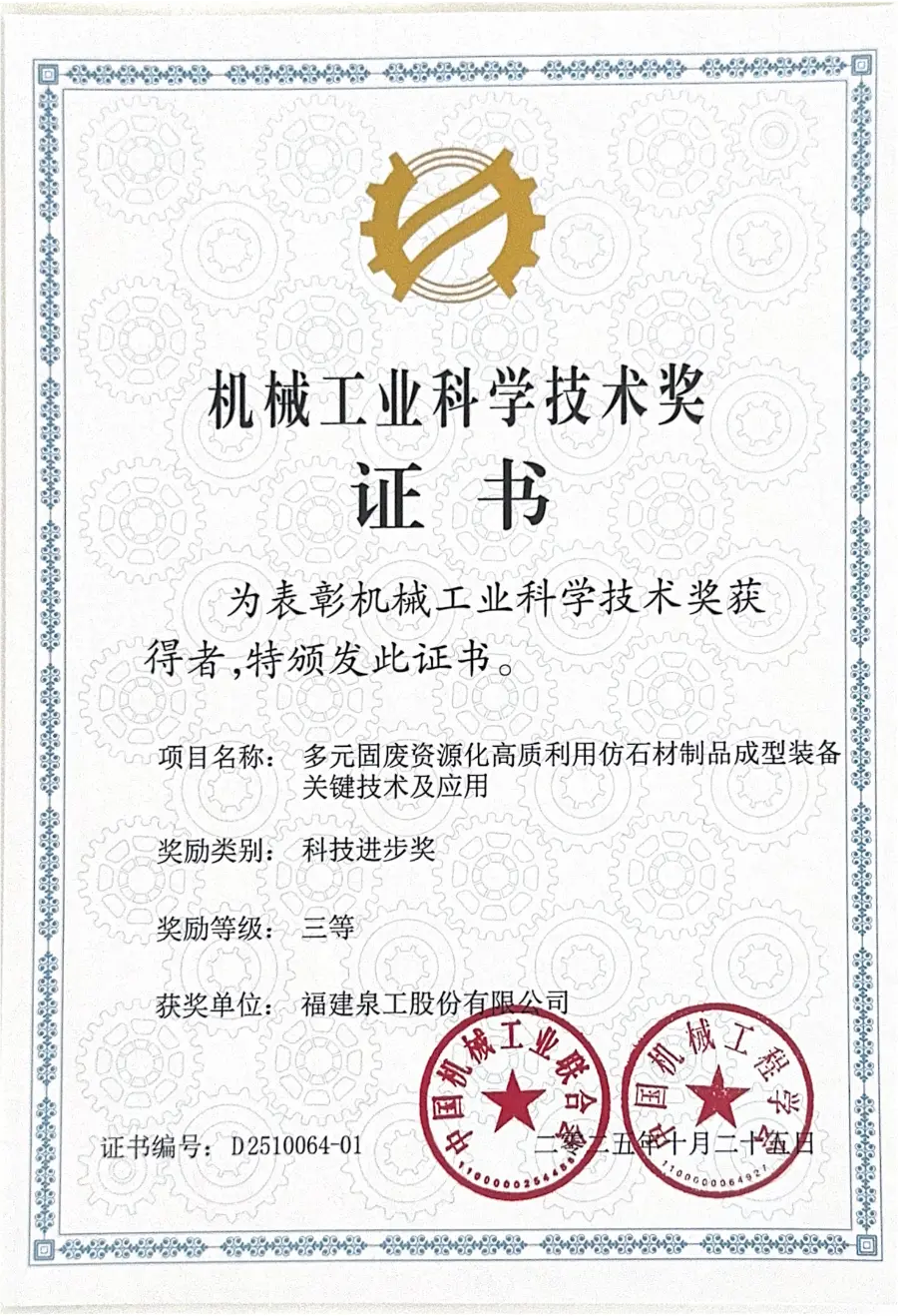 ເມື່ອບໍ່ດົນມານີ້, ໄດ້ປະກາດລາຍຊື່ຜູ້ຊະນະລາງວັນວິທະຍາສາດອຸດສາຫະກຳກົນຈັກຈີນ 2025 ຢ່າງເປັນທາງການ. ໂຄງການ “ເຕັກໂນໂລຢີຫຼັກໆ ແລະ ການນຳໃຊ້ອຸປະກອນການສ້າງແບບຢ່າງໃຫ້ຄຸນຄ່າສູງຂອງຊັບພະຍາກອນສິ່ງເສດເຫຼືອທີ່ຫຼາກຫຼາຍເຂົ້າໃນຜະລິດຕະພັນຫີນຈຳລອງ”, ນຳໂດຍ ບໍລິສັດ ຟູຈ້ຽນກວາງຈີ້ ເຄື່ອງຈັກຈຳກັດ, ໄດ້ລາງວັນທີ 3 ດ້ານຄວາມກ້າວໜ້າທາງດ້ານເຕັກໂນໂລຊີ. ລາງວັນນີ້ສະແດງໃຫ້ເຫັນຢ່າງເຕັມສ່ວນການຮັບຮູ້ສູງຂອງQuangong Machinery Co., Ltd.ຄວາມສາມາດປະດິດສ້າງທາງດ້ານເຕັກໂນໂລຊີ ແລະຜົນສຳເລັດຂອງການນຳໃຊ້ວິສະວະກຳໃນຂະແໜງການນຳໃຊ້ຊັບພະຍາກອນສິ່ງເສດເຫຼືອທີ່ມີມູນຄ່າສູງ ແລະອຸປະກອນສ້າງອັດສະລິຍະສຳລັບຜະລິດຕະພັນຫີນຈຳລອງ.
